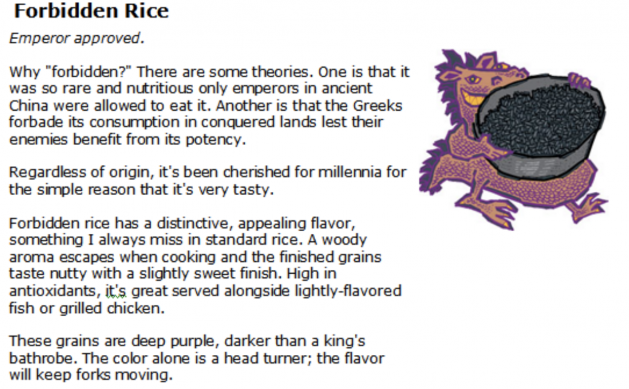 I’d have to assume their ad was successful. At the time I’m writing this, their website shows they’re sold out of this Forbidden Rice. Not sure how many pounds they had, or how much they actually paid per pound, but I’d be willing to bet at their rate of $10.00 per pound, they made quite a nice profit. What do you think?
