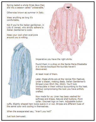 At the J. Peterman Company, they are masters at keeping things fascinating. They are trying to sell a shirt, and yet they start out talking about hot summers in Italy. Are they crazy?